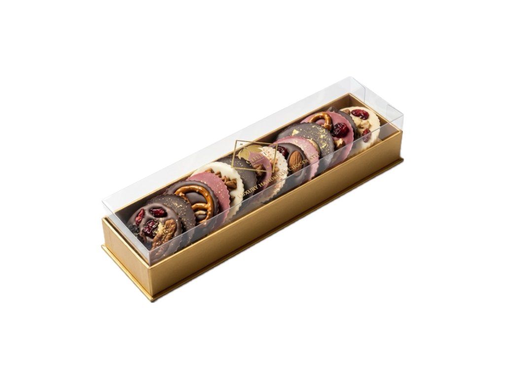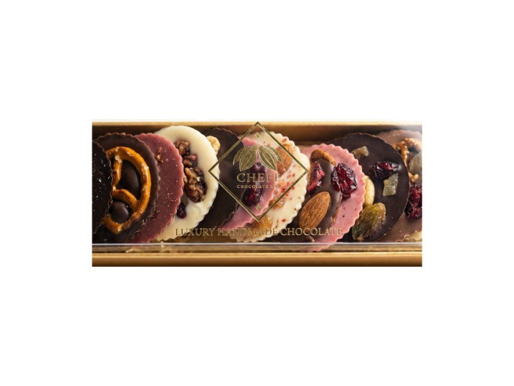 Objevte krabičku čokoládových mendiantů Big Mix od Cheff Chocolate Bar – exkluzivní čokoládové disky z prémiové belgické hořké, mléčné, ruby a bílé čokolády. Každý mendiant je ručně zhotoven z vybraných surovin nejvyšší kvality a zdoben sušeným ovocem, křupavými ořechy, pepřem a jedlými květy růží, které dodávají vizuální půvab i bohatou kombinaci chutí a textur.