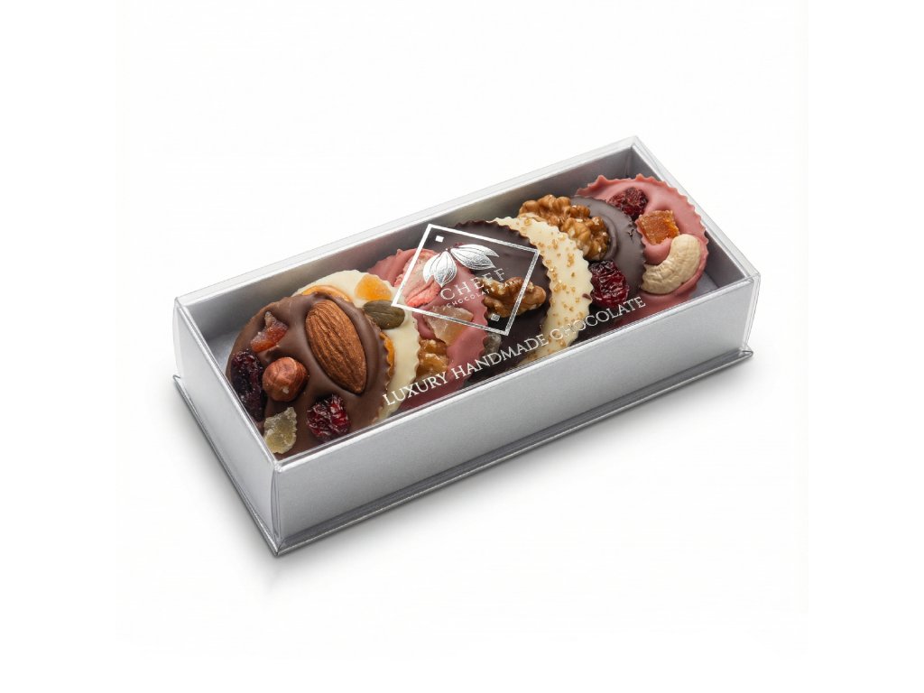 Objevte krabičku čokoládových mendiantů „Small Mix“ od Cheff Chocolate Bar — ručně vyrobený výběr malých čokoládových disků z prémiové čokolády (hořká, mléčná, ruby a bílá). Každý mendiant je zdoben sušeným ovocem, křupavými ořechy, pepřem a jedlými květy růží, které dodávají nejen vizuální půvab, ale i bohatou kombinaci chutí a textur.