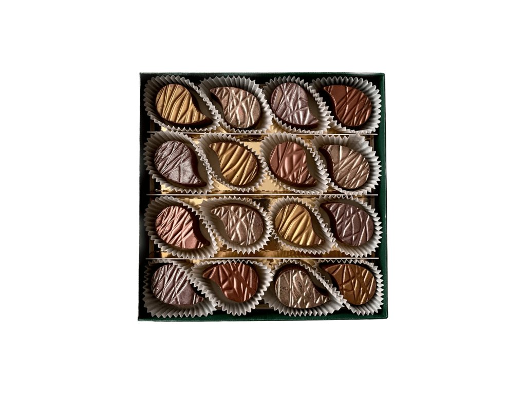 Luxusní bonboniéra Glamour s ručně vyráběnými čokoládovými pralinkami z prémiové belgické čokolády, krémové ganache a jemných likérů — exotické příchutě pro gurmánský zážitek.