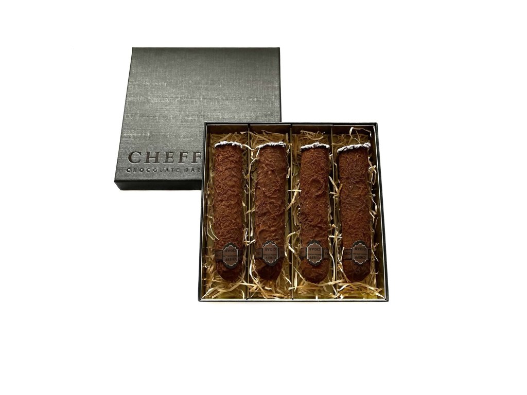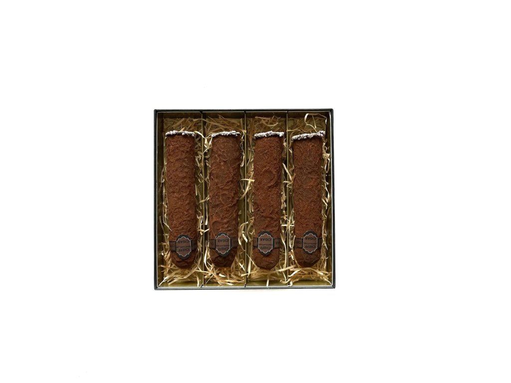 Elegantní sada čtyř ručně vyrobených čokoládových doutníků Whiskey & Espresso — lahodný mix hořké čokolády, espressa a whisky od Cheff Chocolate Bar.