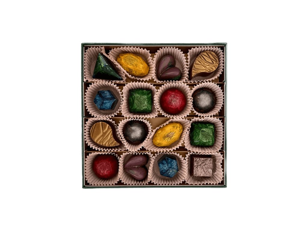 Dárková krabička 16 ručně malovaných čokoládových pralinek Mix z prémiové belgické čokolády — ovocné a klasické příchutě pro gurmánský zážitek.