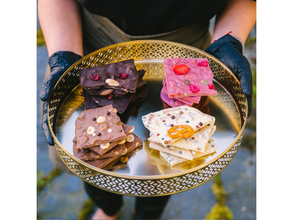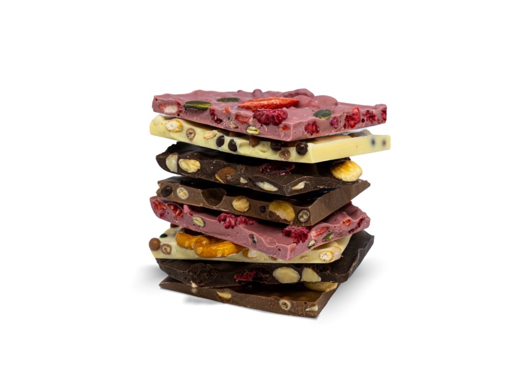 Prémiová lámaná čokoláda Mix od Cheff Chocolate Bar — objevte čtyři lahodné příchutě: mléčnou, ruby, bílou a hořkou.