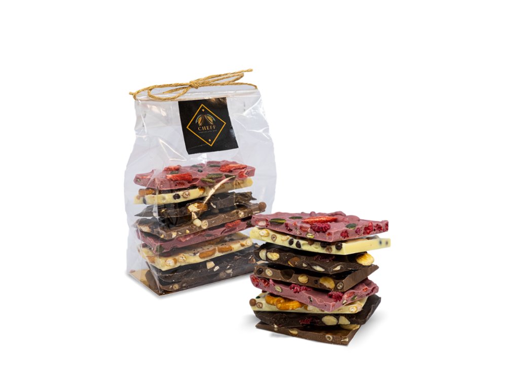 Ochutnejte náš bestseller — jedinečný Mix lámané čokolády od Cheff Chocolate Bar, ručně vyrobený z prémiových belgických čokolád s lahodnými přísadami: ořechy, semínky, ovocem a křupinkami.